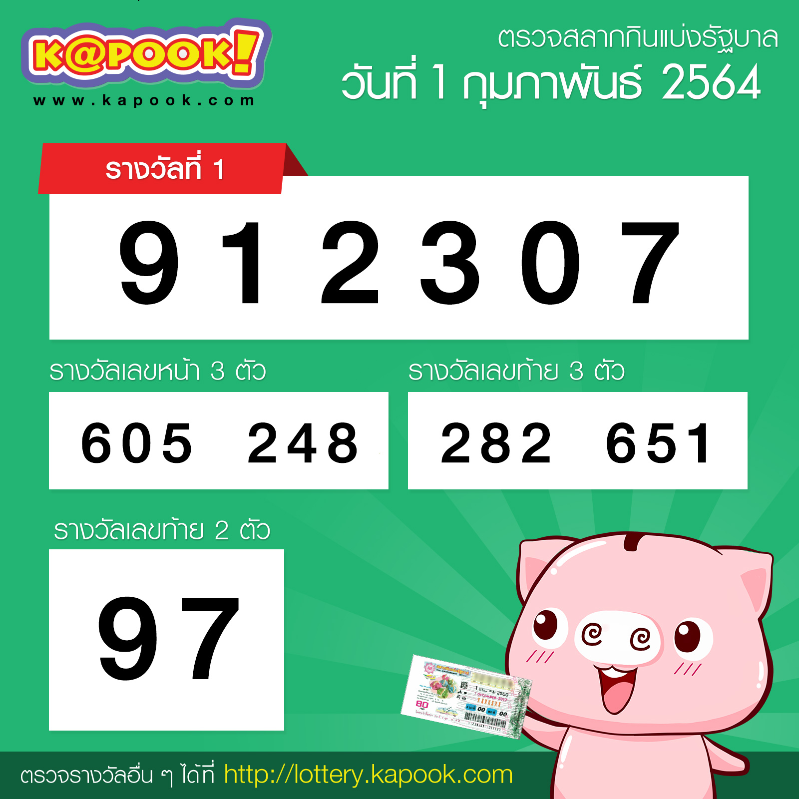 ตรวจหวย ล็อตเตอรี่ ผลสลากกินแบ่งรัฐบาล งวด 1 มีนาคม 2564 ทุกรางวัล.